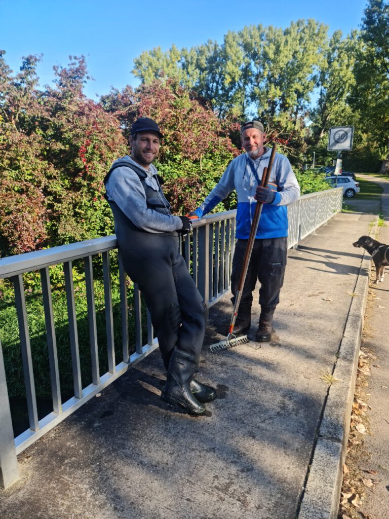 Auch der Angelsportverein Singen-Bohlingen engagierte sich: Am 20. September trafen wir uns am Sportplatz in Bohlingen. Die Mitglieder Zsolt Nagy, Jan Günzel und Simon Wachter tauschten an diesem Tag die Angel gegen Rechen und Gabeln. Ihr Ziel war nicht der Fischfang, sondern die Reinigung der Natur.